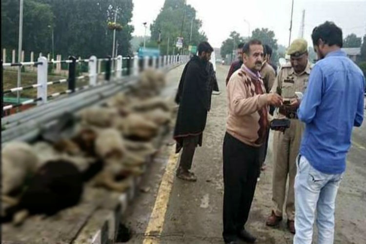 A speeding car has mowed down 25 sheep owned by a shepherd from Bakerwal community on Srinagar's Abdullah Bridge. The bridge turned red as dead sheep lied scattered all over the road. Video showed the heartbreaking footage where the shepherd family is seen crying as onlookers clicked video.