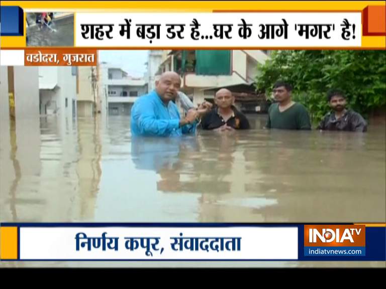 Water from the overflowing Vishwamitri river entered several localities in the city, on Wednesday. Four labourers were killed when a wall collapsed due to heavy rain in Chhani area of Vadodara, Chief Minister Vijay Rupani said.