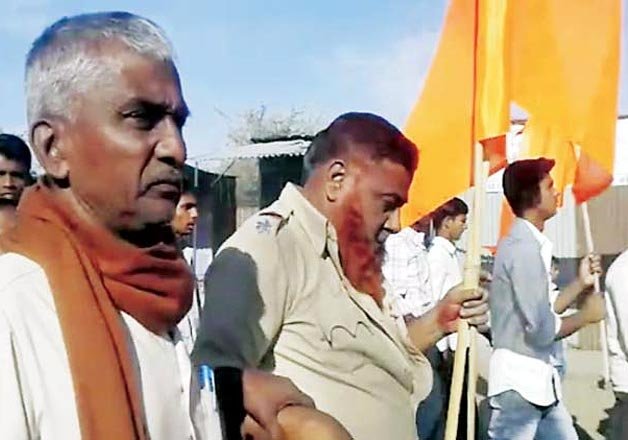 A mob had allegedly beaten up Assistant Sub-Inspector Yunus Shaikh (57) and manhandled his colleague K Awaskar when they prevented them from putting up the flag at a controversial spot in Pangaon village.