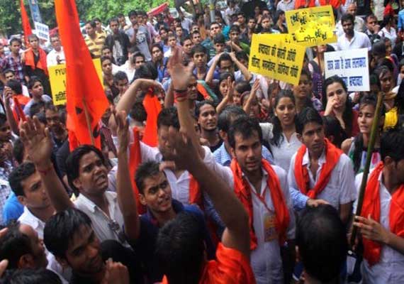 New Delhi: Hundreds of Akhil Bharatiya Vidyarthi Parishad (ABVP) activists today staged protest outside the office of Union Public Service Commission (UPSC) here, demanding the scrapping of Civil Services Aptitude Tests (C-SAT).