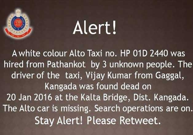 “A white colour Alto taxi No. HP 01D 2440 was hired from Pathankot by three unknown people. The driver of the taxi, Vijay Kumar from Gaggal, Kangada was found dead on 20 Jan 2016 at the Kalta Bridge, District Kangada. The Alto car is missing. Search operations are on. Stay Alert!" read Delhi Police's official twitter handle.