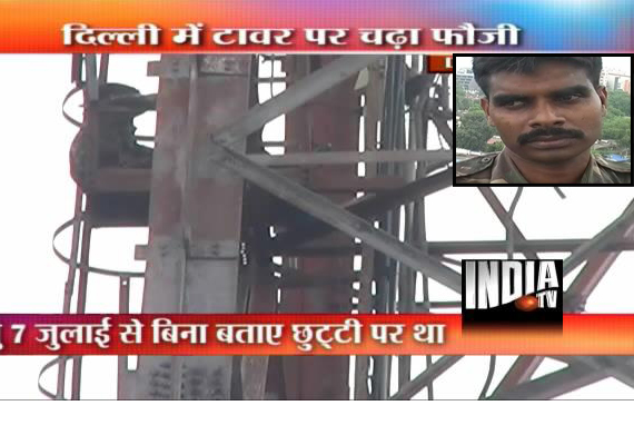 New Delhi, Aug 18 : Muthu, a jawan working in the Army Engineering Corps, has been staging a protest 200 feet above the ground atop a cellphone tower near New Delhi railway station since Friday afternoon.
