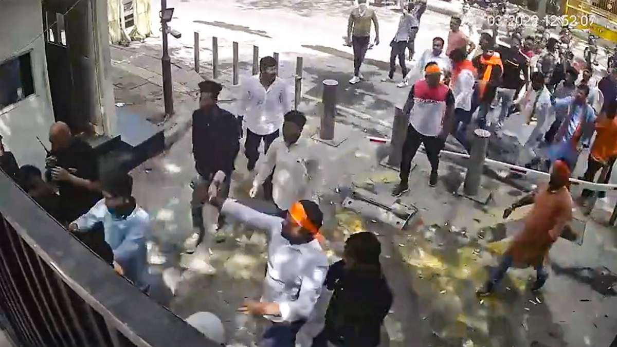 The BJP's youth wing damaged property outside the residence of Kejriwal on Wednesday during a protest against his remarks on 'The Kashmir Files' film.