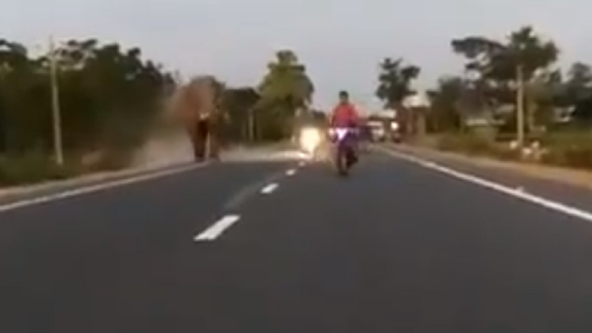 A biker escaped a life-threatening encounter with an elephant while he was crossing a road when the angry 'jumbo' was too passing on the road.