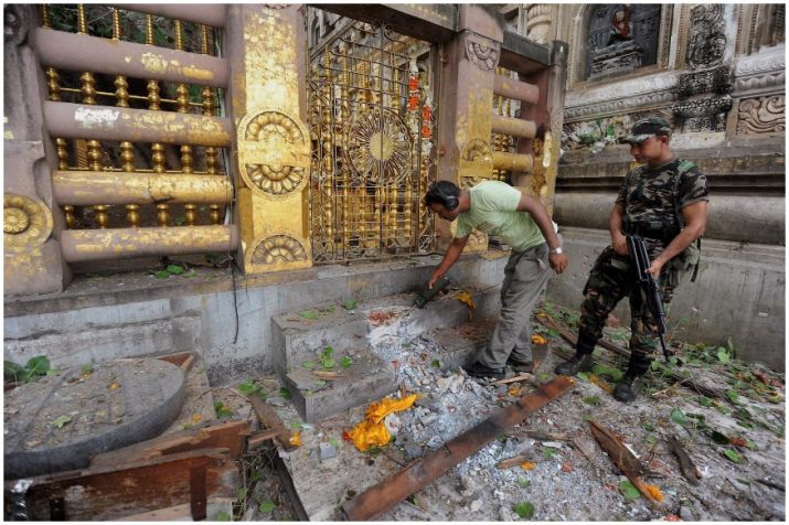 In July 2013, at least 10 bombs went off in the Bodh Gaya's Mahabodhi temple complex injuring five people. An unexploded cylinder bomb was also recovered from the temple complex.