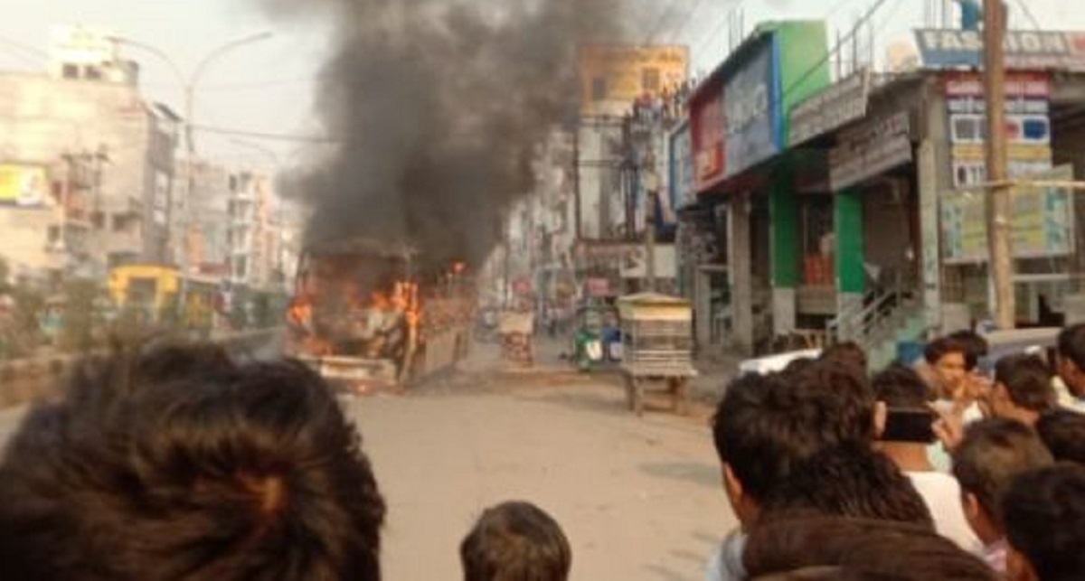 A bus engulfed in flames in Uttar Pradesh's Noida on Wednesday. The incident was reported from sector 49 of Noida, in Barola village.