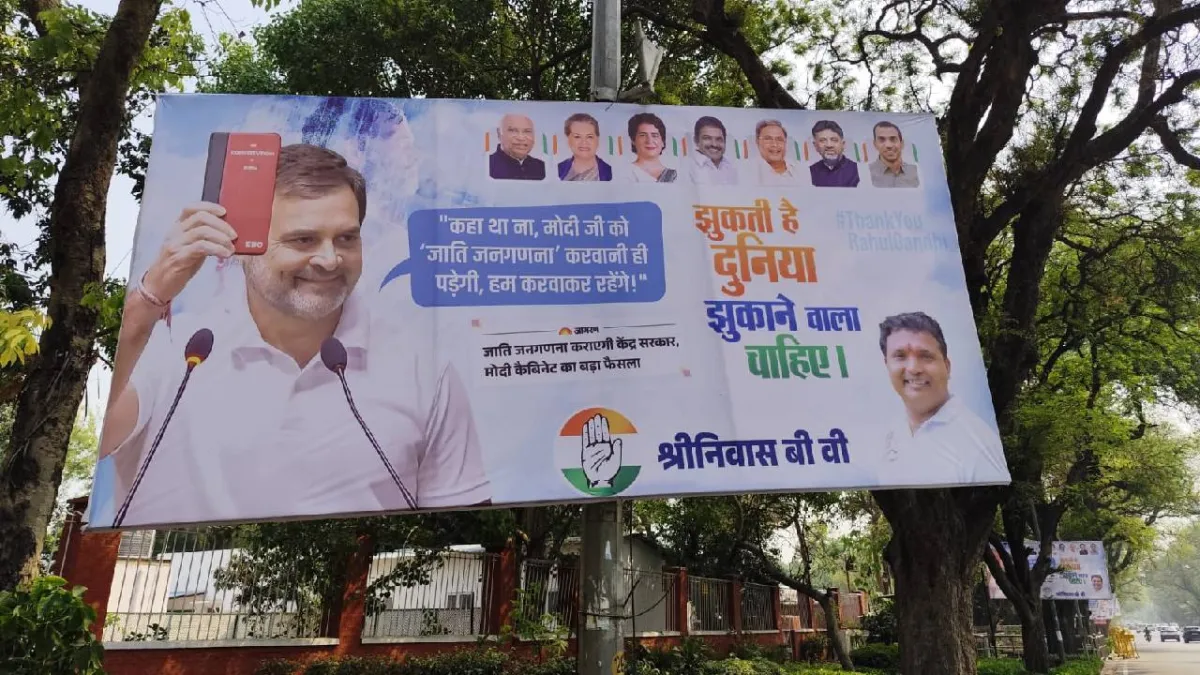 The poster, put up by party leader Srinivas BV, features a photograph of Mr Gandhi, Leader of the Opposition in the Lok Sabha, who has consistently called for a nationwide caste Census. The message on the poster highlights that this move would open the door for stronger affirmative action policies to support disadvantaged communities.