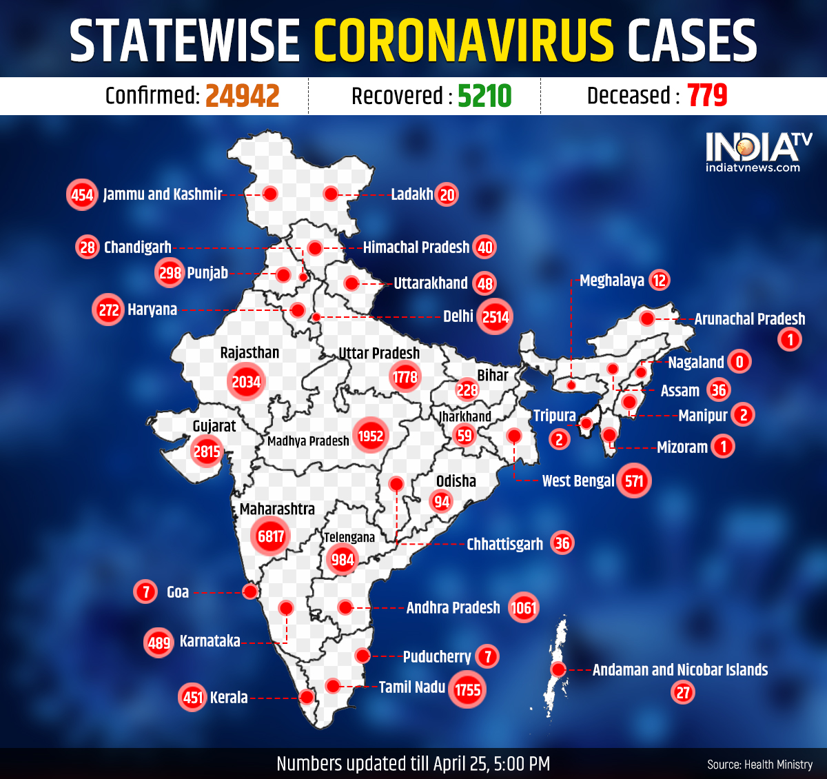 The death toll due to coronavirus has risen to 779 in India while the cases have jumped to 24942, the Ministry of Health said in an update on Saturday. About 1490 new cases of the virus and 56 deaths were recorded in the last 24 hours. According to the official figures, Maharashtra continued to remain on the top with 6817 confirmed cases of the virus and 301 deaths. Gujarat was second with 2815 patients and 127 deaths. Next in line was Delhi with about 2514 infections while 53 succumbed to the disease. Rajasthan followed with 2034 cases and 27 deaths.