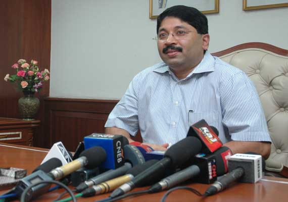 The poster also features the pictures of DMK president M.Karunanidhi, his son M.K.Stalin and Maran's father, the late Murasoli Maran.