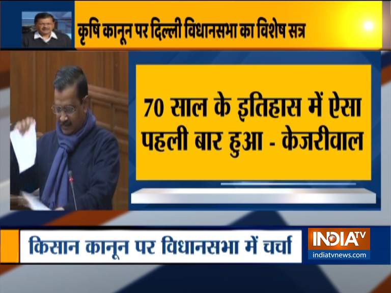"What was the hurry to get farm laws passed in Parliament during pandemic? It has happened for first time that three laws were passed without voting in Rajya Sabha.I hereby tear three farm laws in this assembly and appeal Centre not to become worst than Britishers," Kejriwal said as he tore copies of the legislations.