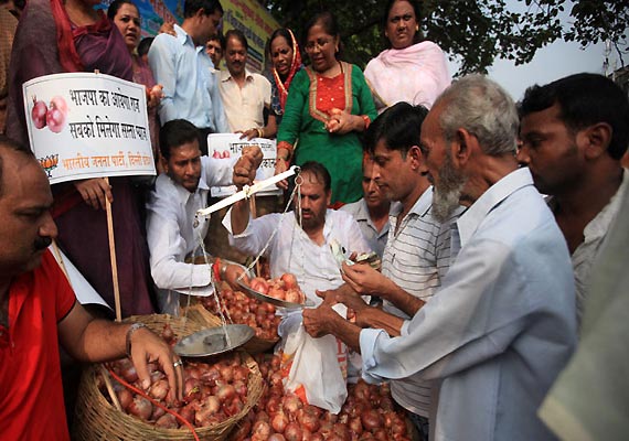 Delhi BJP has been attacking the city government on the issue of high onion prices. It held demonstration outside Chief Minister Sheila Dikshit's official residence at 3, Motilal Nehru Marg in Central Delhi on Wednesday.