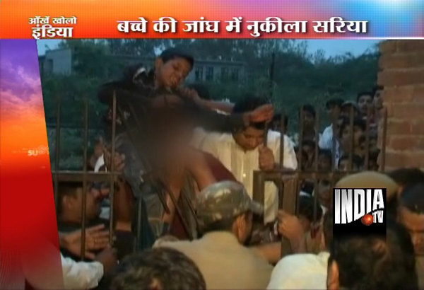 New Delhi, Apr 25: A pointed iron rod on a gate pierced the knee of a 13-year-old boy Iqrar on Tuesday trigerring a major rescue effort by firemen in Delhi's Sultanpuri.