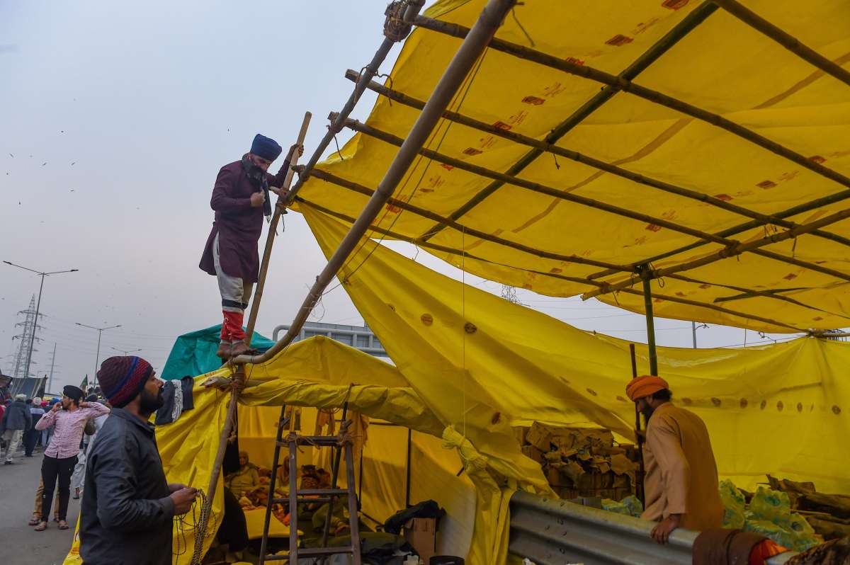 As sporadic rains continued in Delhi, many tents at Singhu border where farmers have been staying since November 26 last year collapsed, while some started leaking. Also, many of tents had to be dismantled and re-erected.