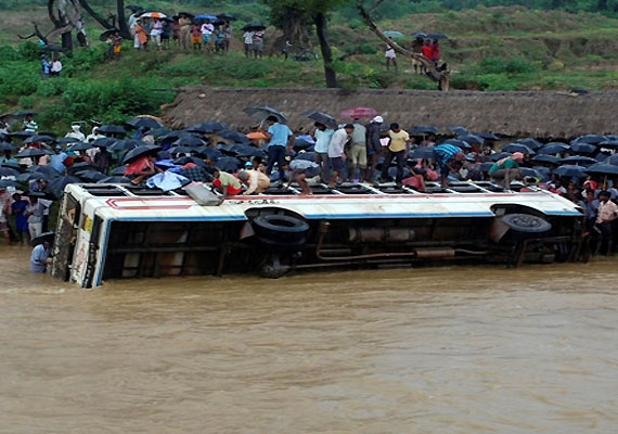 The accident occurred Thursday as the bus with around 50 passengers was crossing a low bridge in blinding rain. The driver lost control and the bus fell into the river, police said.
