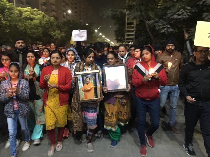 People took out candlelight march in Gaur City, Greater Noida on Thursday to protest the death of resident Gaurav Chandel. Gaurav was returning to his home in 5th avenue in Gaur City when he was robbed and murdered. His body was recovered at Parthala Chowk later.