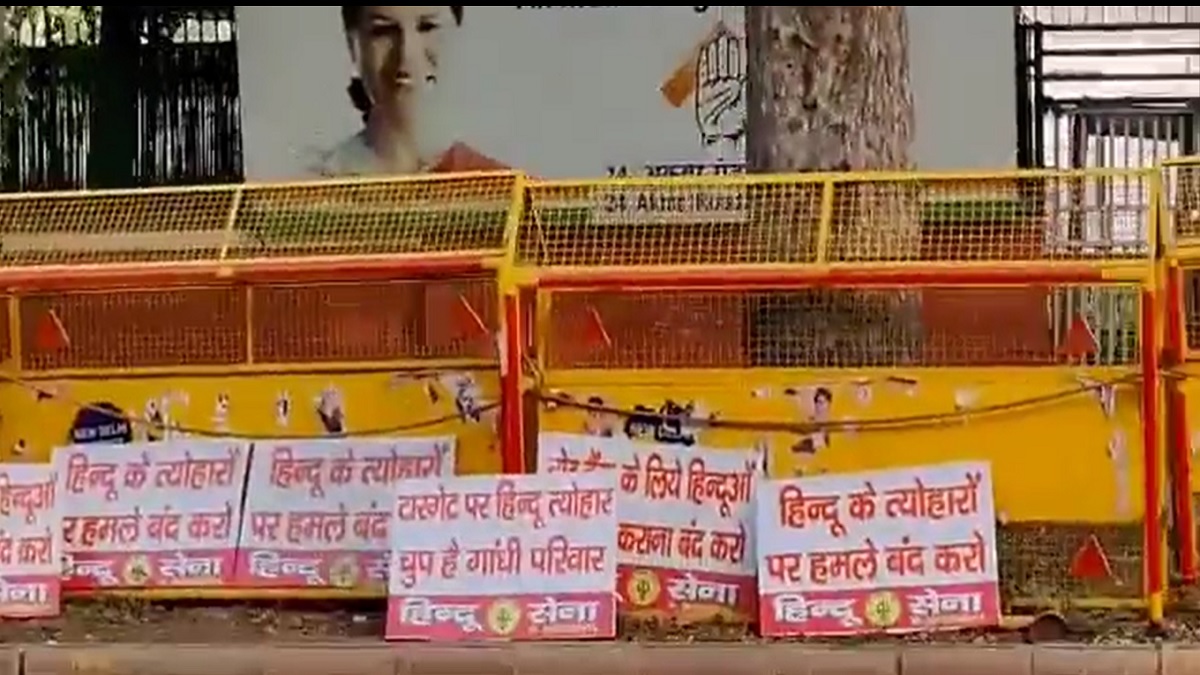 - Hindu Sena activists puts up posters outside Congress Headquarters at 24, Akbar Road