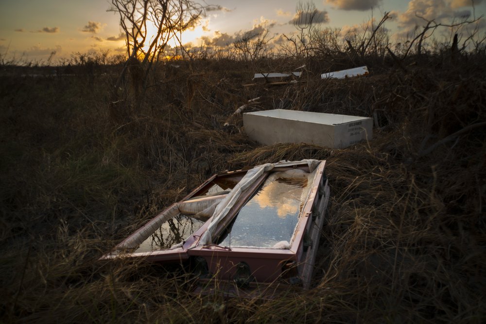 A black-and-blue tie floated nearby in a pool of water and beyond that, a ruptured set of drums toppled. Nearby, bone-white seashells nestled in tufts of grass, flung by surging floodwaters that a week ago carried Saunders for 200 yards until he grabbed hold of a large pine tree and spent two days on a branch after Hurricane Dorian hit the island.