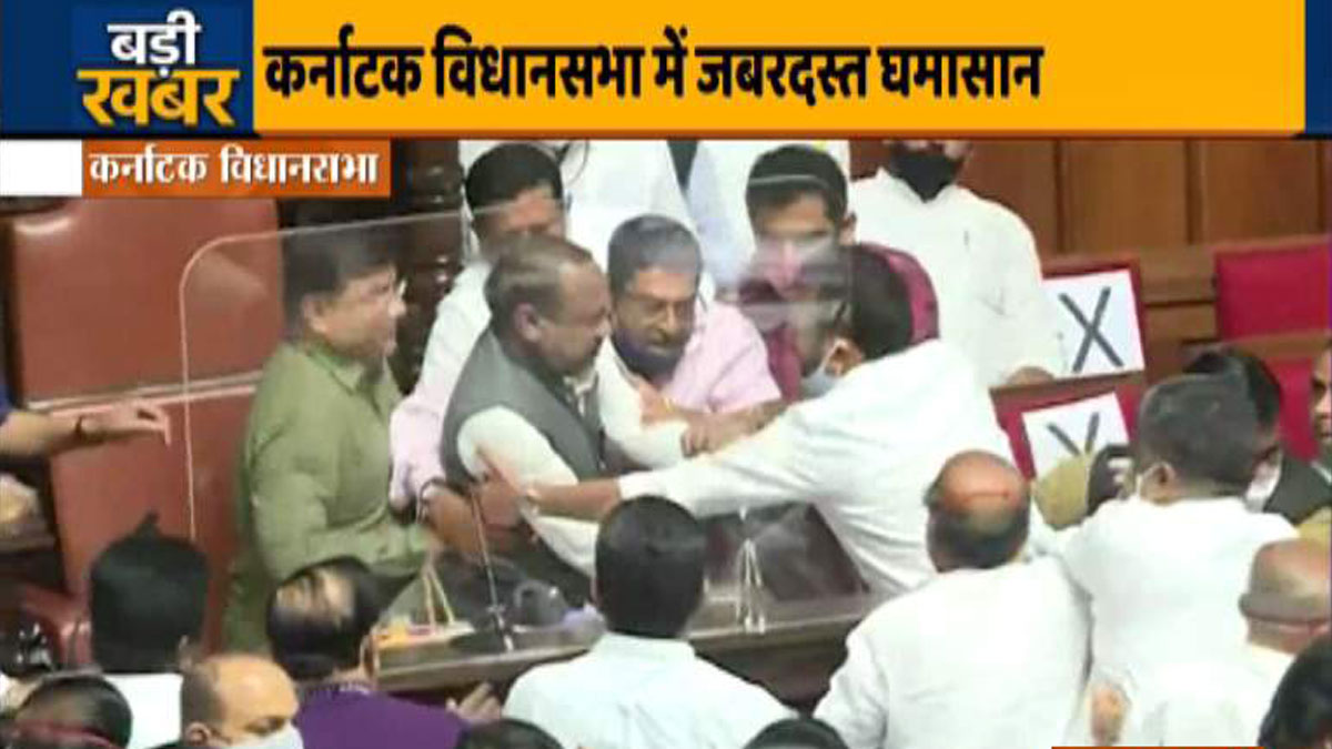 A high octane drama unfolded inside the Karnataka Legislative Council on Tuesday when Congress MLCs heckled and pushed Deputy Chairman of the Legislative Council, SL Dharme Gowda, from his seat. Visuals show that the Congress MLCs forcibly removed Dharme Gowda from the seat. Dharme is a JDS MLC.