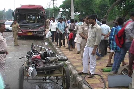 According to the eyewitnesses and the police, the incident happened on the Nangloi-Najafgarh road, where two floor busses, in a rush to get ahead of one another, bumped into a standing low floor bus and also hit three motorcyclists and a bicycle rider who were passing by.