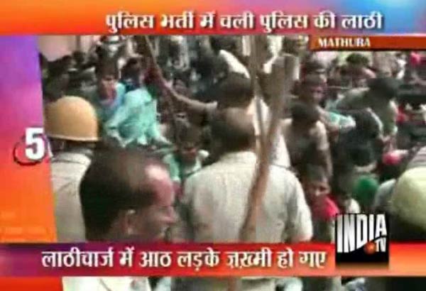 Mathura, Aug 10 : The Mathura police on Tuesday lathicharged a fairly large crowd of unemployed youths who had gathered to buy application forms for recruitment to police service in the district.