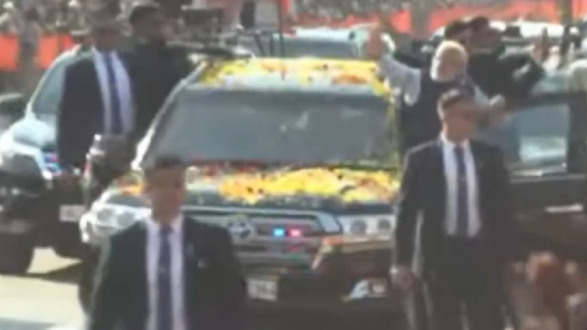 The Prime Minister held a road show by greeting a large number of people, who had gathered on both sides of the route, and showered flower petals as his cavalcade passed through the stretch slowly. Standing on the 'running board' of his car, Modi greeted by waving at the crowd, many of whom were seen chanting 'Modi, Modi' and 'Bharat Mata ki Jai' slogans.
