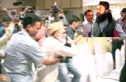 Lucknow, Oct 14: Shahi Imam of the Delhi Jama Masjid, Maulana Syed Ahmed Bukhari today lost his cool when a Muslim journalist questioned him regarding the Ayodhya verdict during a press conference following which he was thrashed by supporters of the cleric.