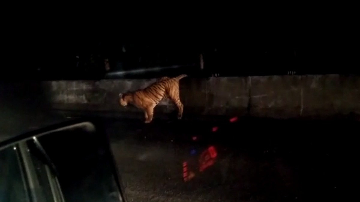 The tiger exhausted after several failed attempts, sits on the flyover for two hours. After people saw the tiger sitting on the flyover they started clicking pictures and recording videos of the wild animal.