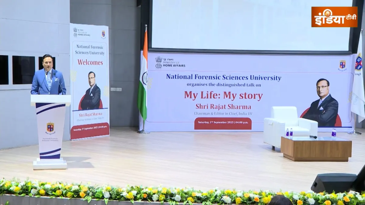 India TV Chairman and Editor-in-Chief Rajat Sharma gave a special address on 'My Life: My Story' as the chief guest during an event at the National Forensic Science University in Gujarat's Gandhinagar on Saturday. During the programme, he was honoured by the university. Rajat Sharma spoke at length about his life, recalling the struggles of his early years and sharing the story of his popular TV show Aap Ki Adalat. A video of the show was also played during the event.