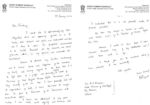 "I would like to affirmatively say that allegations which are appearing against me in the media both electronic and print are unfounded and baseless and I deny the same," Justice Ganguly said in his resignation letter to Governor M K Narayanan in the wake of allegations of sexual harassment against him by a law intern. The resignation has been accepted and forwarded to the Chief Secretary of West Bengal government by the Governor.