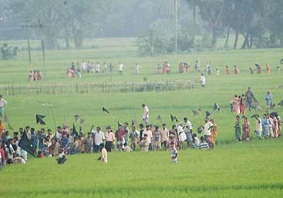 Their faces and hair painted green, the farmers cheered Trinamool Congress leader and convenor of the Krishi Jami Raksha Committee, which spearheaded the anti-land acquisition stir in Singur that had helped Mamata Banerjee ascend to power, as he addresed a gathering of unwilling land-owners this morning.