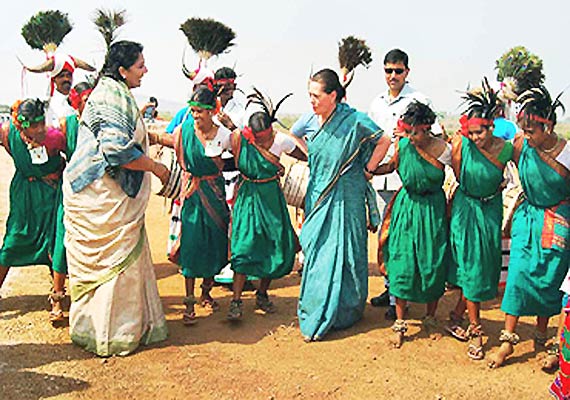 After addressing a national convention on empowerment of tribal women organised by Mahila Congress, Gandhi came down from the stage to mingle with the tribal women and soon joined them in their dance.