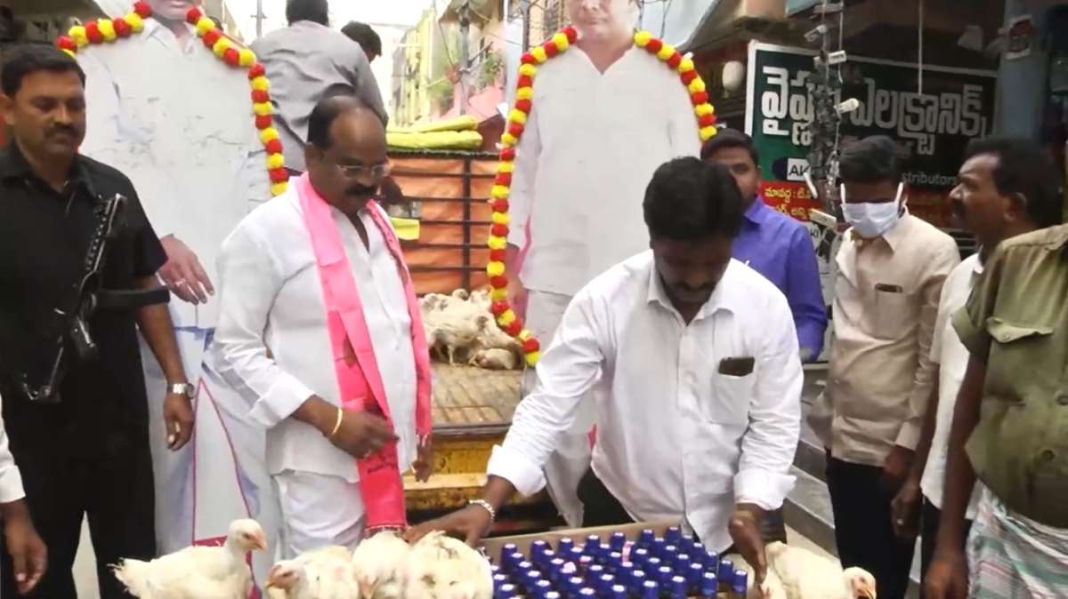 Telangana news: TRS leader Rajanala Srihari on Tuesday distributed liquor bottles and chicken to locals in Warangal ahead of Chief Minister KCR's launching of a national party tomorrow.