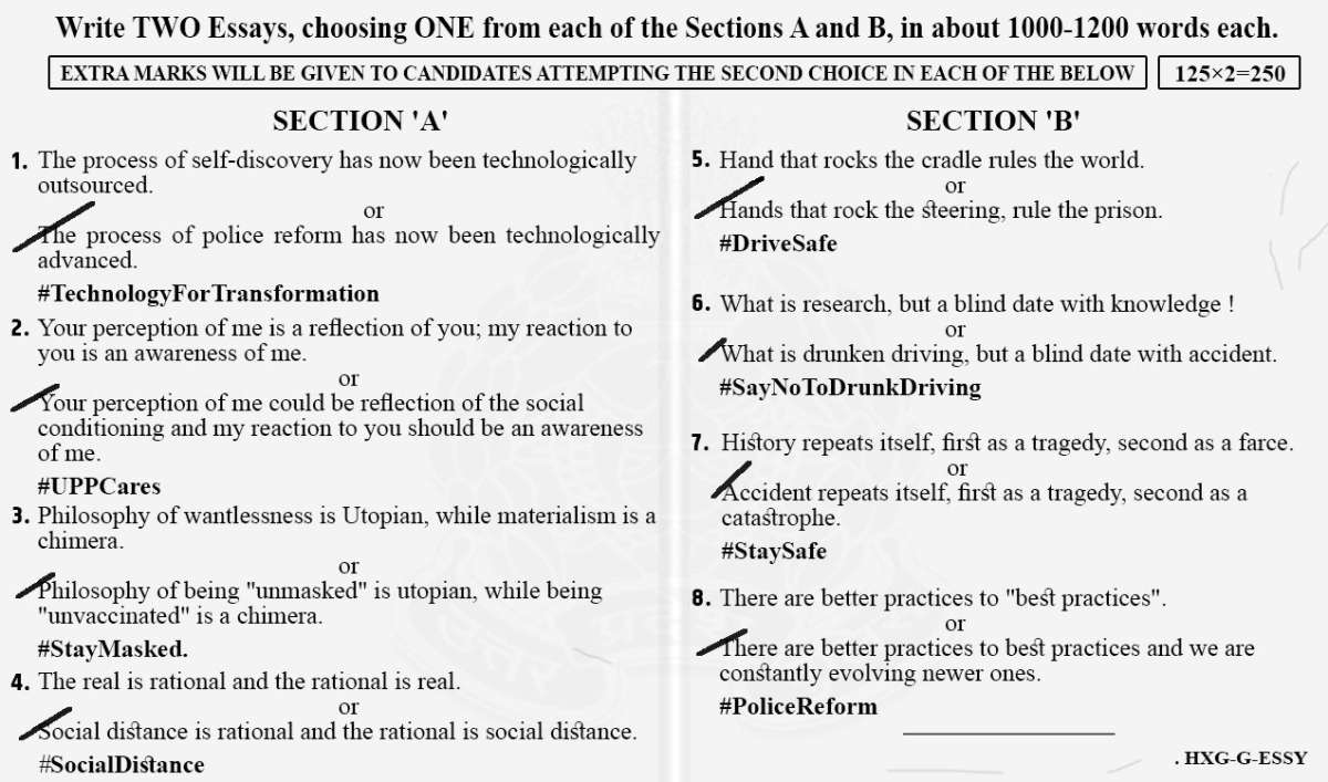 After the UPSC essay paper went viral on Twitter, the UP Police released their own set of essay papers of two sections. Under Section A, UP Police's questions were - 'Philosophy of being 'unmasked' is utopian, while being 'unvaccinated' is a chimera and 'Social distance is rational and rational is social distance'. Under Section B, their questions were 'Hands that rock the steering, rule the prison' and 'Why is drunken driving, but a blind date with accident'.