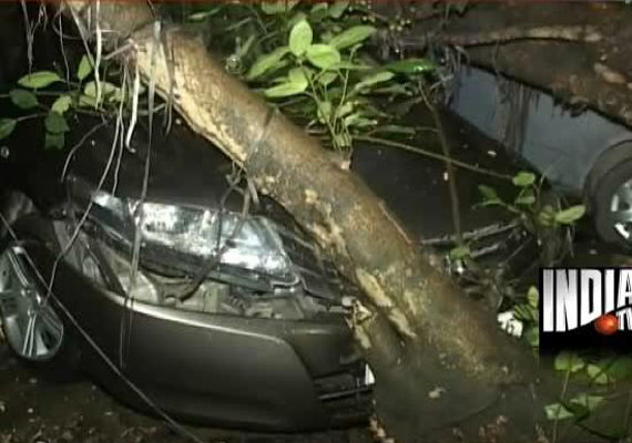 New Delhi, Aug 28: A tree was uprooted due to strong wind and heavy rain in South Campus area of South Delhi on Monday evening and it fell on two luxury cars parked on the roadside.