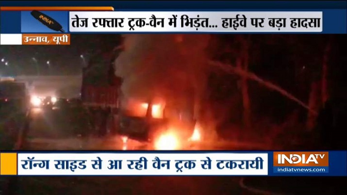 Three persons were charred to death when a van collided head-on with a truck on the Unnao-Hardoi highway on Sunday night. The impact of the accident was so strong that the Van immediately caught fire and the occupants were charred to death inside. The truck was carrying petroleum products and the entire route has been cordoned off. Fire tenders have been rushed to the site.