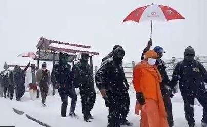 Heavy snowfall on Monday delayed the departure of Uttar Pradesh Chief Minister Yogi Adityanath and his Uttarakhand counterpart Trivendra Singh Rawat for Badrinath after they had offered prayers at Kedarnath temple and attended a ceremony for the closure of its portals for winter.