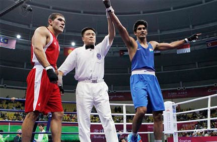 Guangzhou, Nov 26: World number one Vijender Singh (75kg) clinched an unprecedented second boxing gold for India at the ongoing Asian Games while two others settled for silver to round off the best ever campaign by the country's pugilists at the quadrennial mega-event, here today.