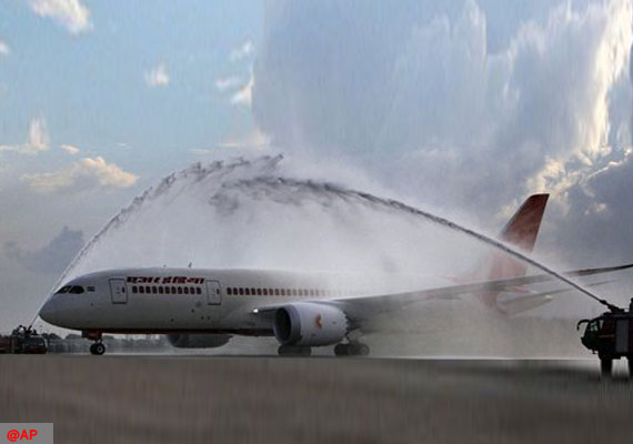 New Delhi, Sep 8: The first Boeing 787 Dreamliner of Air India touched down at the Indira Gandhi International Airport here to a water cannon salute.