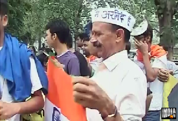 So far Anna's supporters used to wear caps with the message inscribed "Main Anna Hoon", but today the message was different.