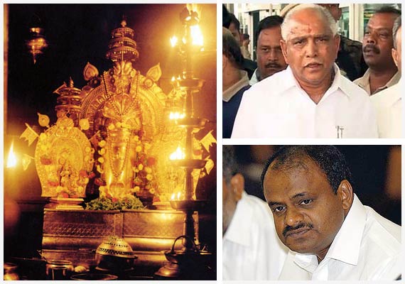 Bangalore, July 29: The Deccan Chronicle on Friday reported that it was a coincidence that the Karnataka chief minister B S Yeddyurappa after inviting Opposition leader H D Kumaraswamy to a challenge before Lord Manjunatha and then evading it, invited divine wrath within a month and was forced to resign.