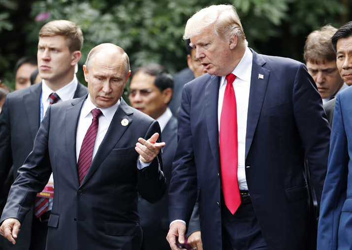 President Donald Trump is crossing paths again with Russian President Vladimir Putin. Trump and Putin chatted today as they strolled to a brief photo op at the Intercontinental Danang Sun Peninsula Resort in Danang, Vietnam.