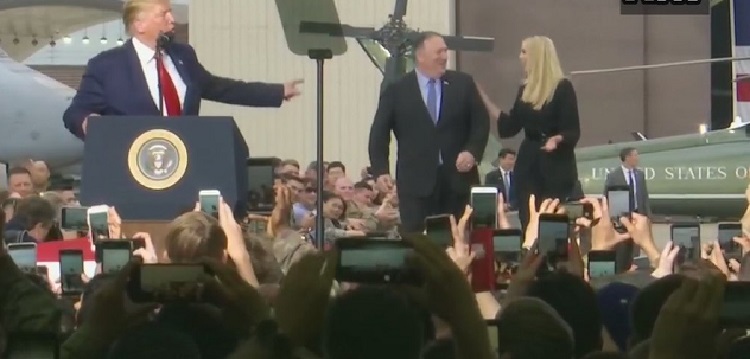 "What a beautiful couple," Trump quipped before his audience of air force personnel, referring to Ivanka Trump and Mike Pompeo. "Ivanka, Beauty and the Beast, Mike."