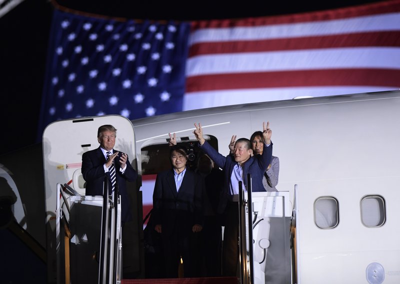 Despite a middle-of-the-night landing, first lady Melania Trump, Vice President Mike Pence and a host of senior administration officials joined Trump to celebrate the occasion. The men, Kim Dong Chul, Kim Hak Song and Tony Kim, had been released Wednesday amid a warming of relations between the longtime adversaries.