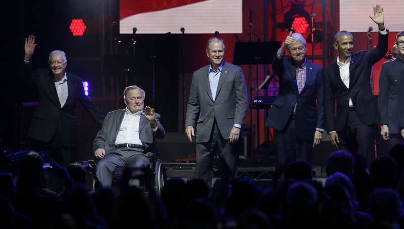 Four of the five former presidents — Obama, George W. Bush, Carter and Clinton — made brief remarks that did not mention Trump. The elder Bush did not speak but smiled and waved to the crowd. They appealed for national unity to help those hurt by the hurricanes.