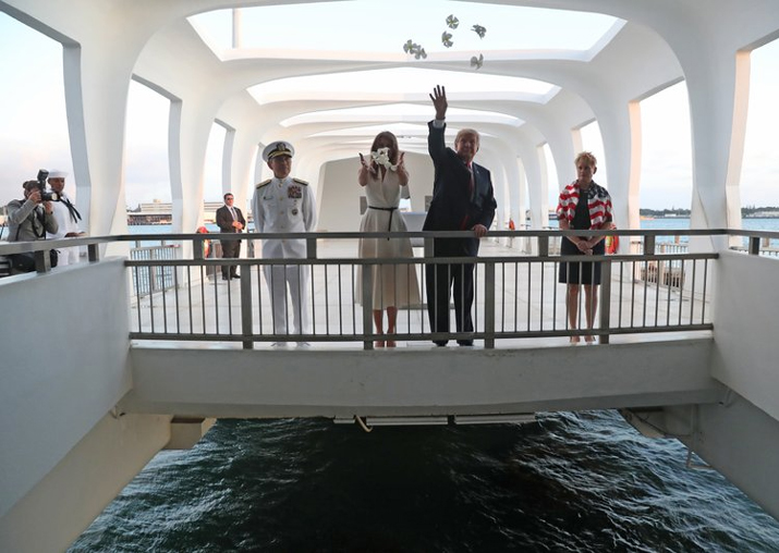 Trump saluted Friday after entering the USS Arizona memorial following a short boat ride with first lady Melania Trump. They approached a wreath of white flowers — a gift from the couple — and watched as two sailors who stood beside it at attention placed the wreath near a wall of names of the fallen.