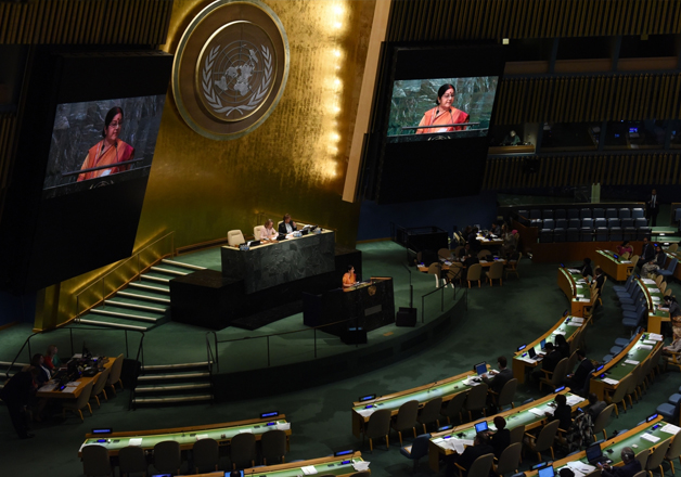 India's External Affairs Minister Sushma Swaraj affirmed at the General Assembly New Delhi's commitment "to play a leading role in combating climate change" and said it would submit the ratification document on a day rich in symbolism, "the birth anniversary of Mahatma Gandhi who epitomised a lifestyle with the smallest carbon footprint".