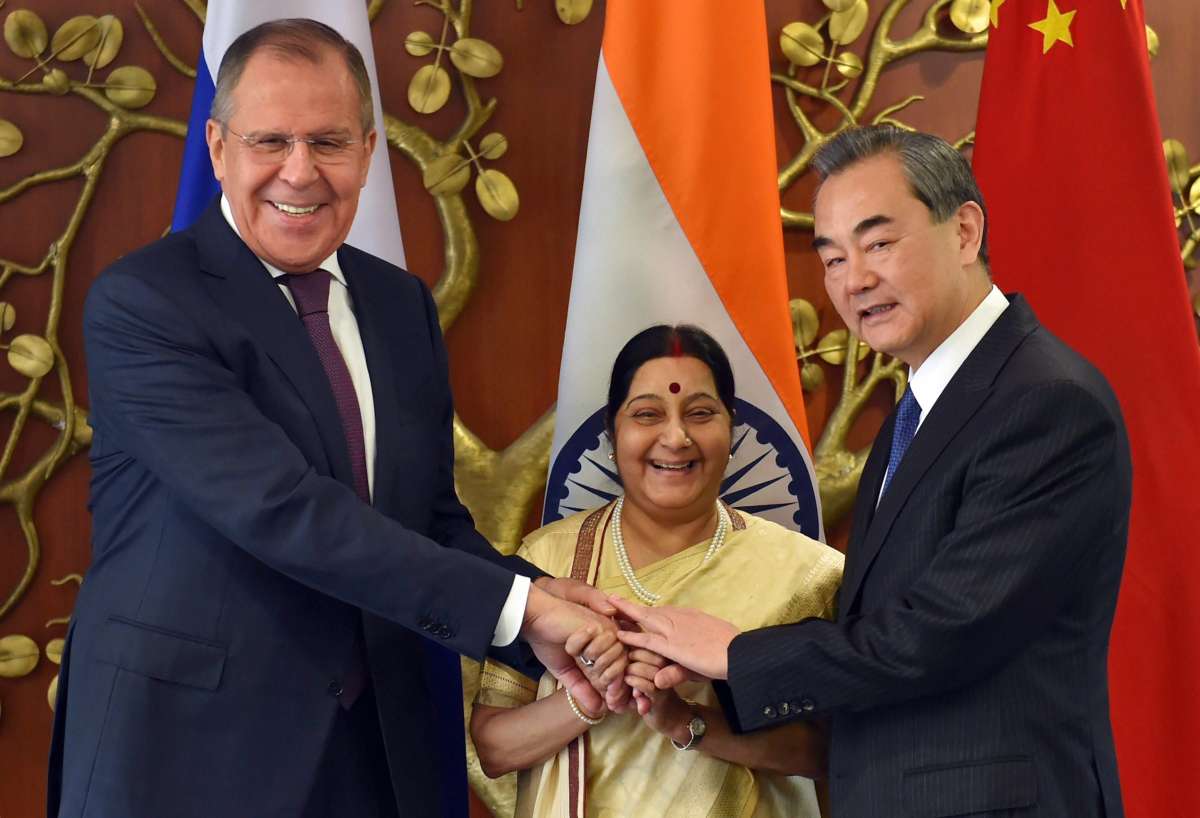 External Affairs Minister Sushma Swaraj along with her Chinese and Russian counterparts Wang Yi and Sergey Lavrov held the 15th Russia-India-China trilateral meeting in New Delhi on Monday.