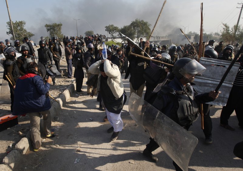 Later in the morning, seminary students from Rawalpindi reinforced the protesters who pushed back police and Frontier Constabulary forces. Witnesses said a group of baton-carrying protesters snatched a tear gas gun and a few shells from a constable and lobbed them at police.