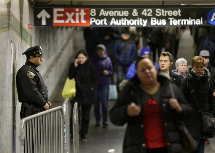 A police officer stands in the passageway connecting New York City’s Port Authority bus terminal and the Times Square subway station Image Source :
