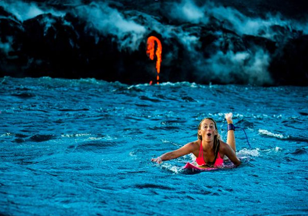 These stunning photographs show the bikini-clad adventurer hot-surfing around an erupting volcano without any fear.